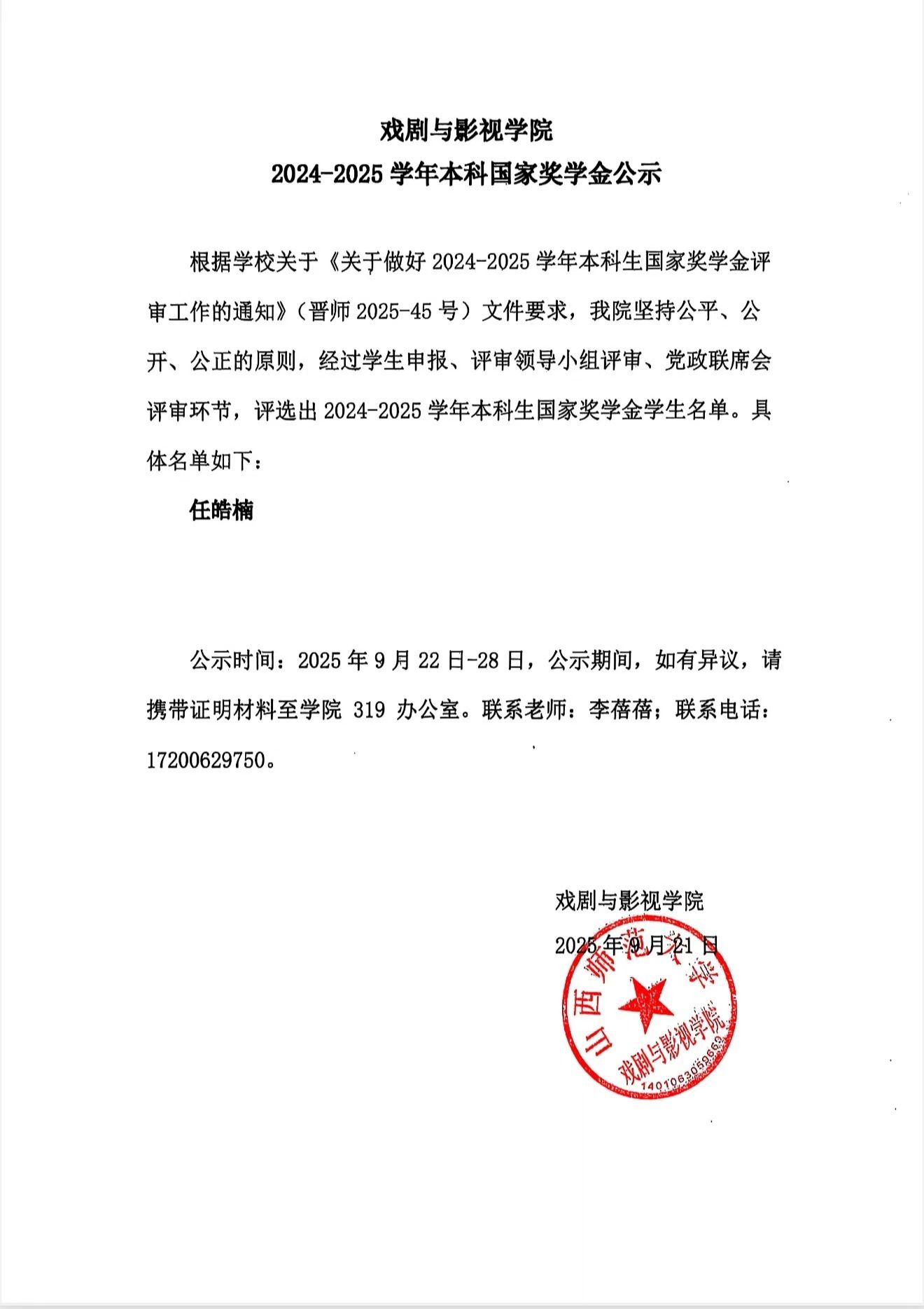 2024-2025学年本科国家奖学金公示