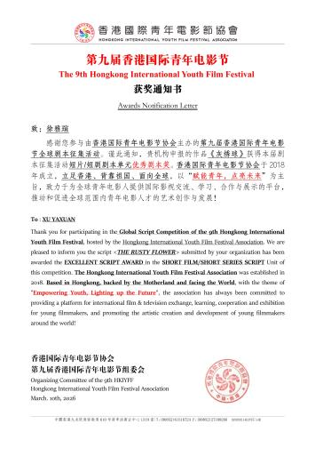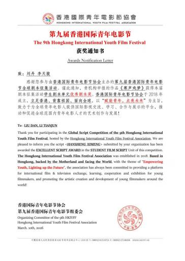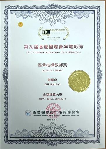 颜汇成老师在第九届香港国际青年电影节全球剧本征集中荣获优秀指导教师奖。