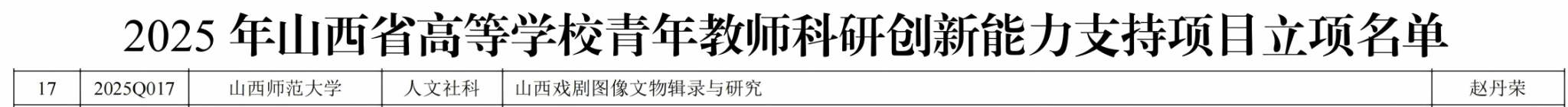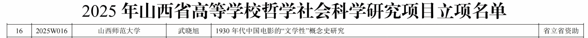 近日,2025年度山西省高等学校科技创新计划各类项目立项名单公布。菠菜导航 赵丹荣老师申报的《山西戏剧图像文物辑录与研究》项目获批山西省高等学校青年教师科研创新能力支持项目立项。武晓旭老师申报的《1930年代中国电影的“文学性”概念史研究》获批山西省高等学校哲学社会科学研究项目立项。
